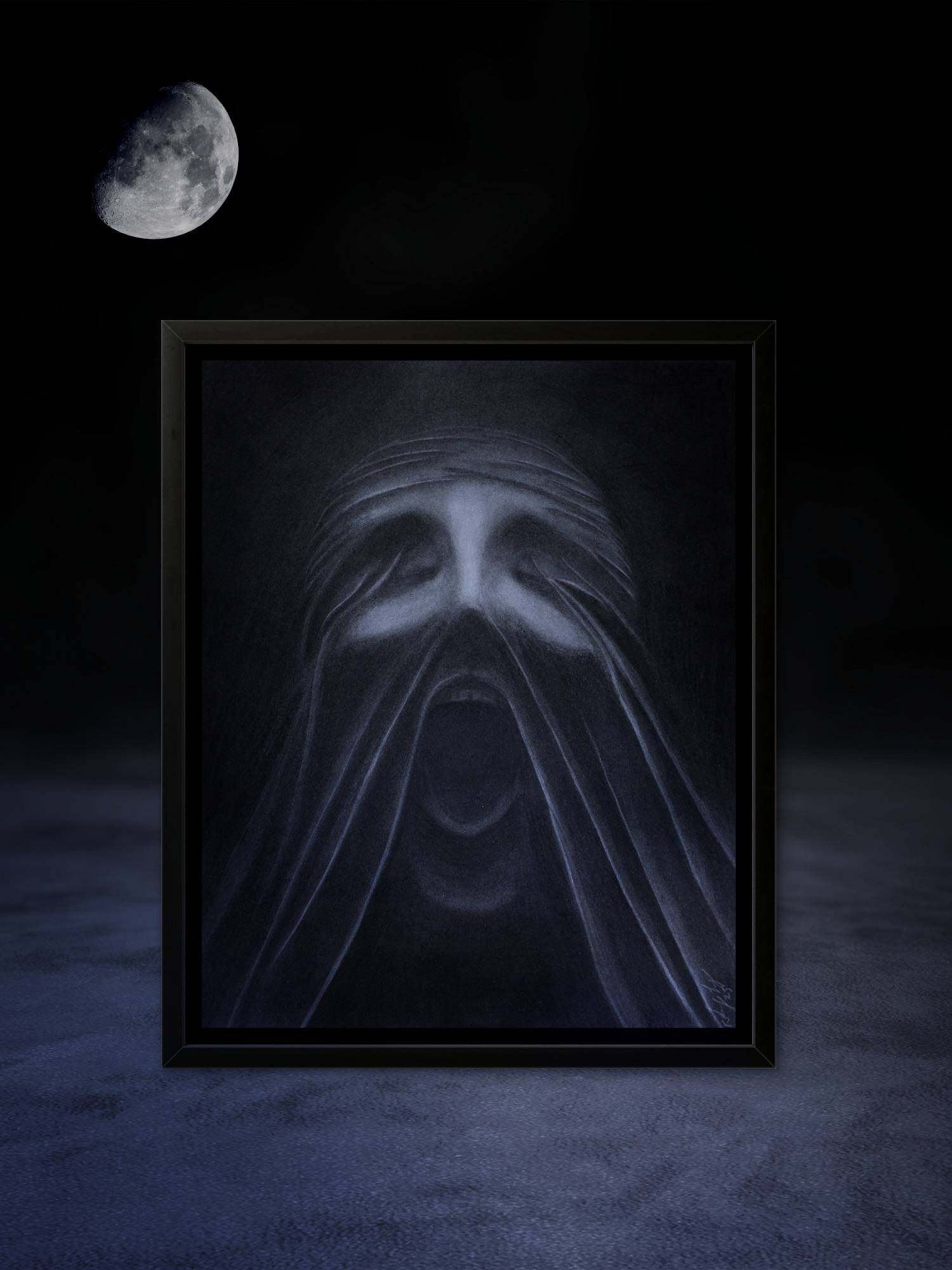"Screaming on the Inside" captures the ethereal essence of concealed emotion through a ghostly figure veiled in darkness. This evocative artwork explores the profound depths of human experience, revealing the buried sadness and desires that reside beneath our composed exteriors. The subtle visibility of the figure creates a powerful visual metaphor for the internal struggles we often hide from the world, inviting viewers to reflect on their own unexpressed emotions.
