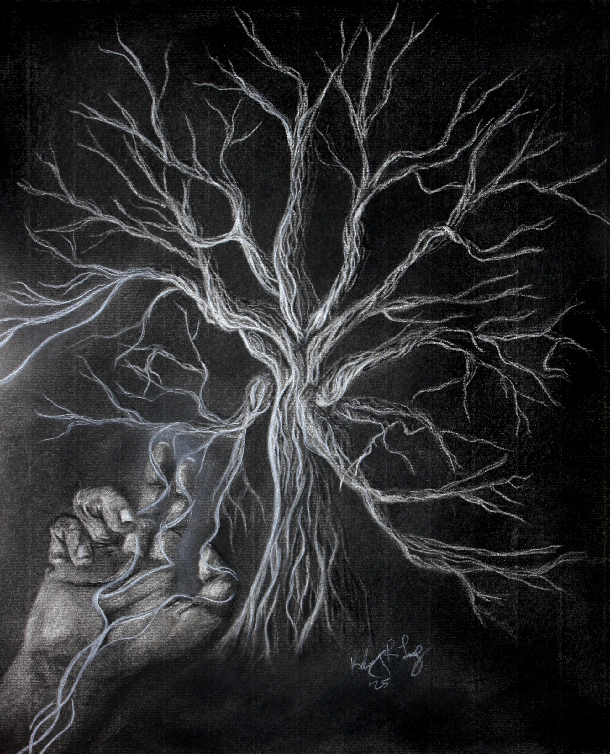 A lone hand glows with quiet power. Channels of energy pulsing outward awaken something vast- a great tree, luminous against the surrounding darkness. This image arose not from careful planning, but from a deep intuitive pull- a need to express the feeling of reaching inward and drawing out something ancient, alive, and transformative.