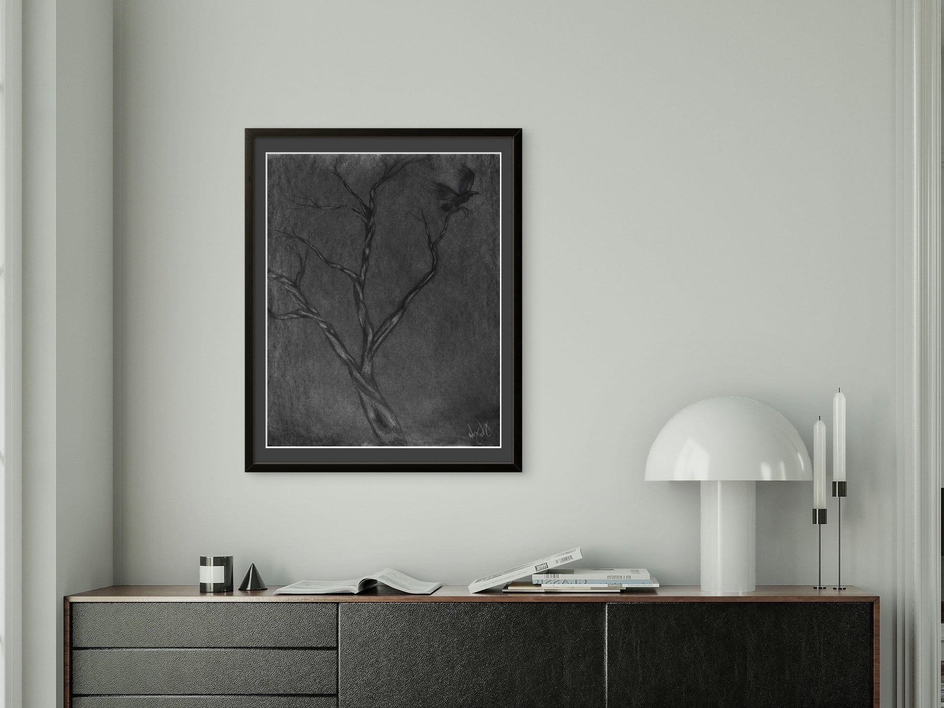 The Unraveling presents a profound visual metaphor for life's transitional states. This sophisticated second installment in the trilogy captures the metamorphosis of a humble vine as it transforms into an expansive tree, guided by an avian harbinger. The composition's deliberate use of shadow and obscurity articulates that pivotal moment when potential confronts uncertainty—when growth occurs despite limited visibility of the path ahead. A reflection on the pivotal moment of metamorphosis, where deconstruction becomes the essential prelude to final fulfillment.